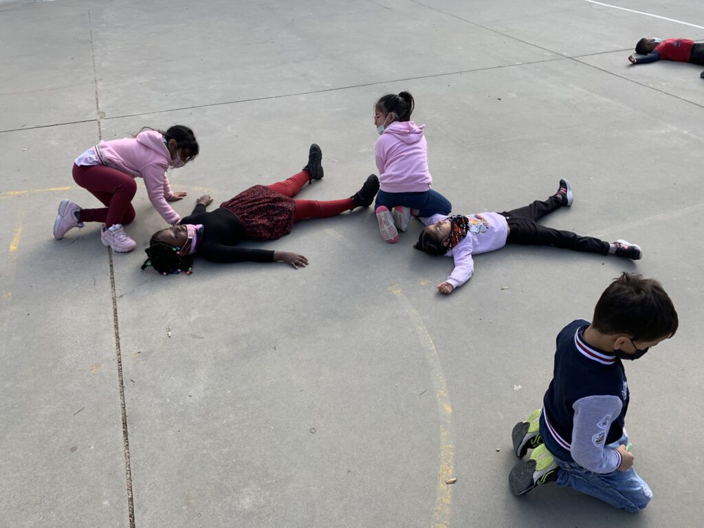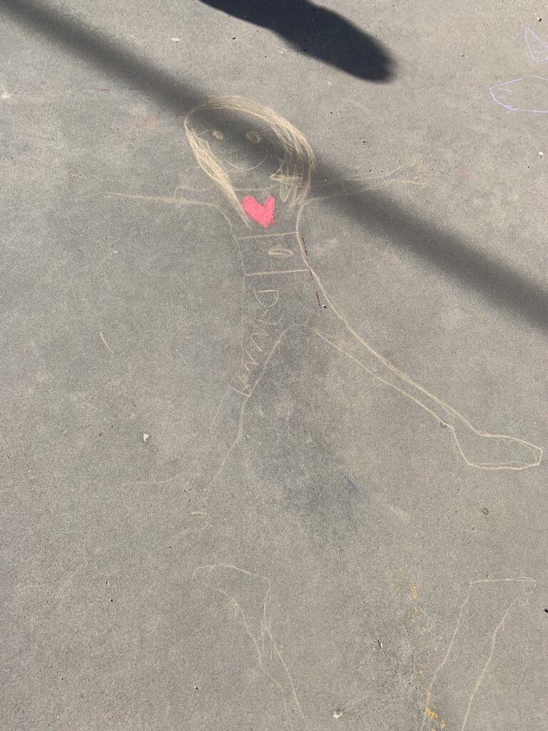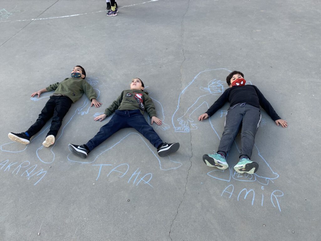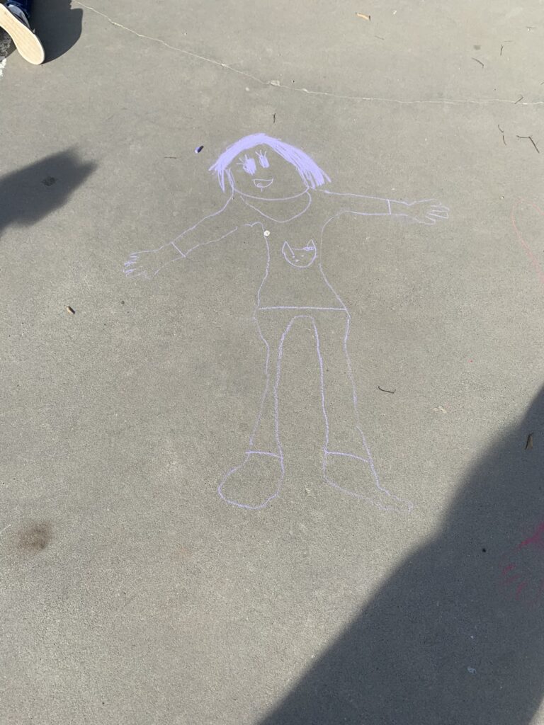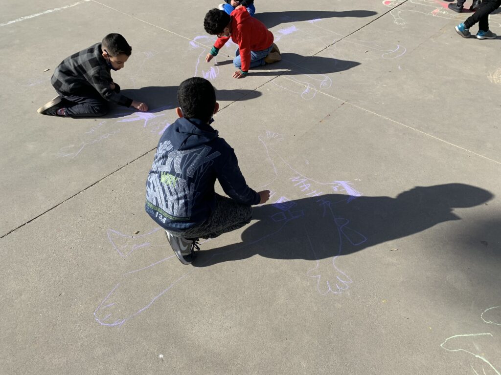 Finalment, vam anar al pati i vam gaudir d’una estona compartida els grups de primer. Va ser una gran oportunitat per passar-ho bé aprenent perquè van dibuixar-se per parelles amb guixos al terra del pati i van poder posar nom a les diferents parts del cos.