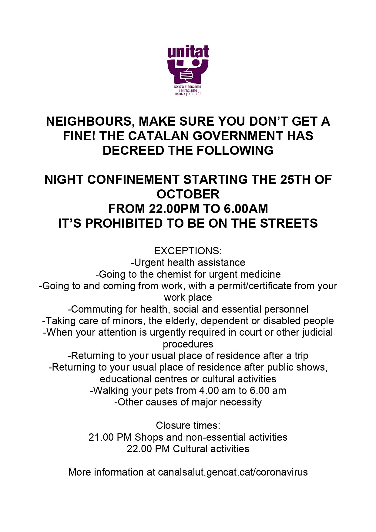 Informació Relativa al Confinament Nocturn. (Català, Anglès i Àrab)Per ins. Antoni Pous / 28/10/2020 / Portada