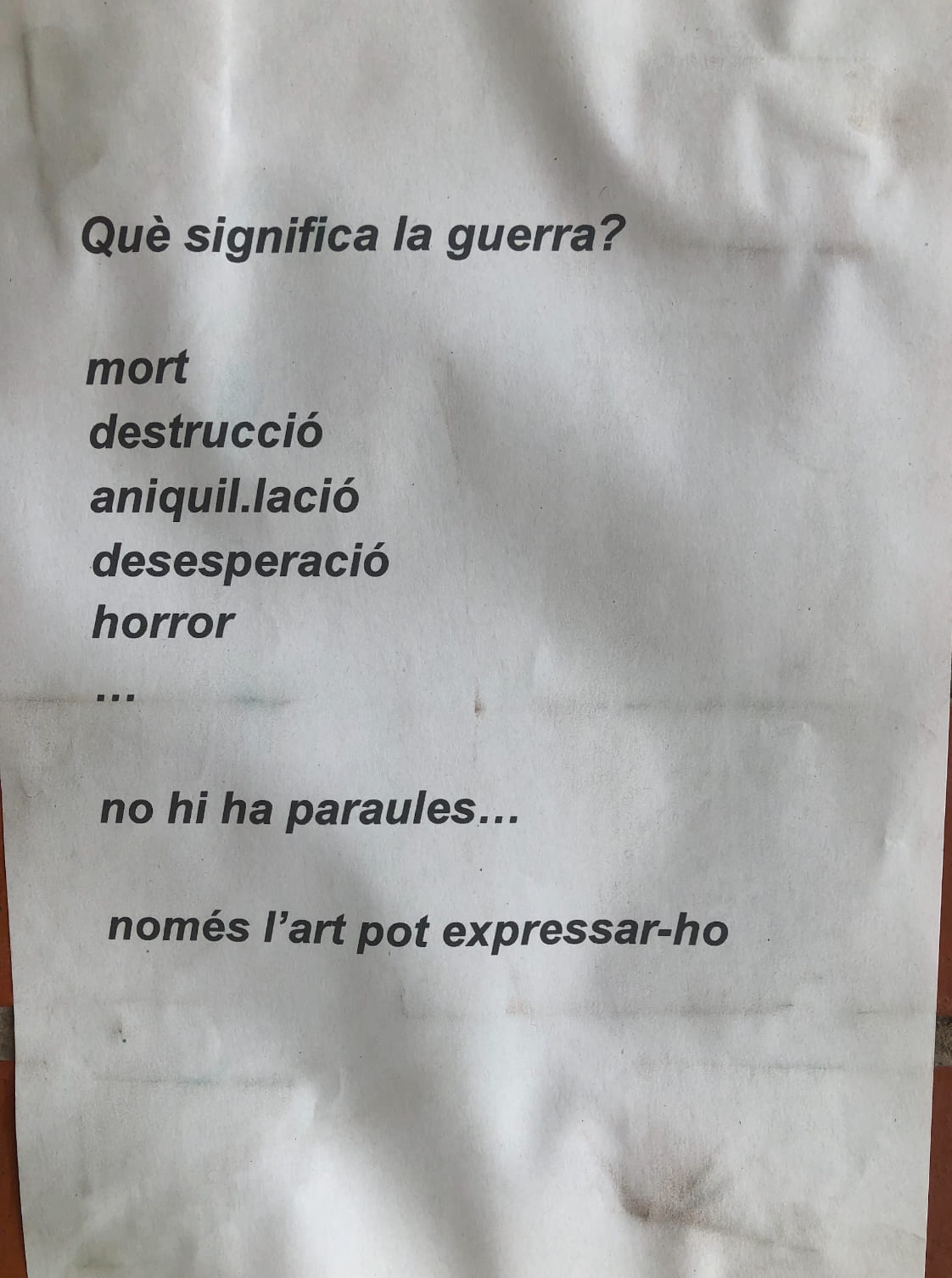 Ens hem preguntat si podríem resoldre els conflictes d’una altra manera. La guerra no es pot explicar amb paraules, així que l’alumnat ha realitzat un treball de reflexió sobre el tema a través de l’art. També han investigat sobre els diferents conflictes que a l’actualitat hi ha al món.