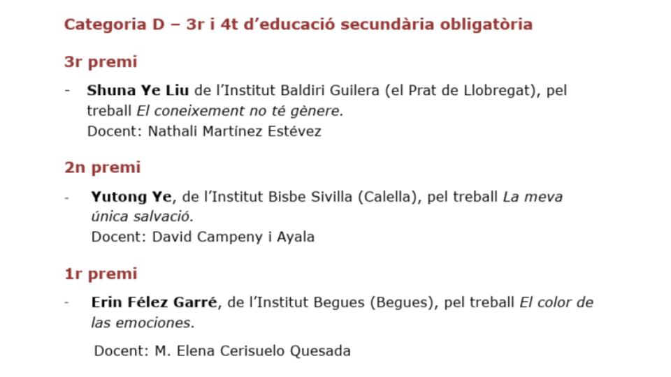 L’alumna L’alumna Shuna Ye Liu, del grup 3 ESO D, ha quedat tercera de tota Catalunya en la Categoria D, corresponent al 3r i 4t d’Educació Secundària Obligatòria.