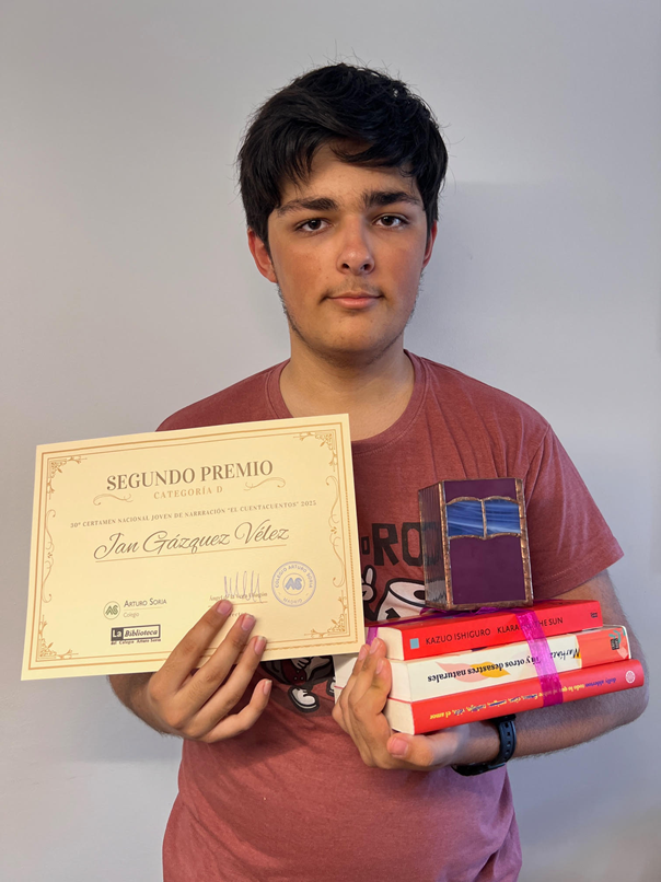 El alumno Jan Gázquez, de 1A Bachillerato, ha quedado en segundo lugar, en la categoría de Bachillerato, en el 30.º Certamen nacional joven de narración  “El Cuentacuentos” que organiza el Colegio Arturo Soria, de Madrid, desde hace treinta años con el objetivo de fomentar la lectura y la escritura literaria