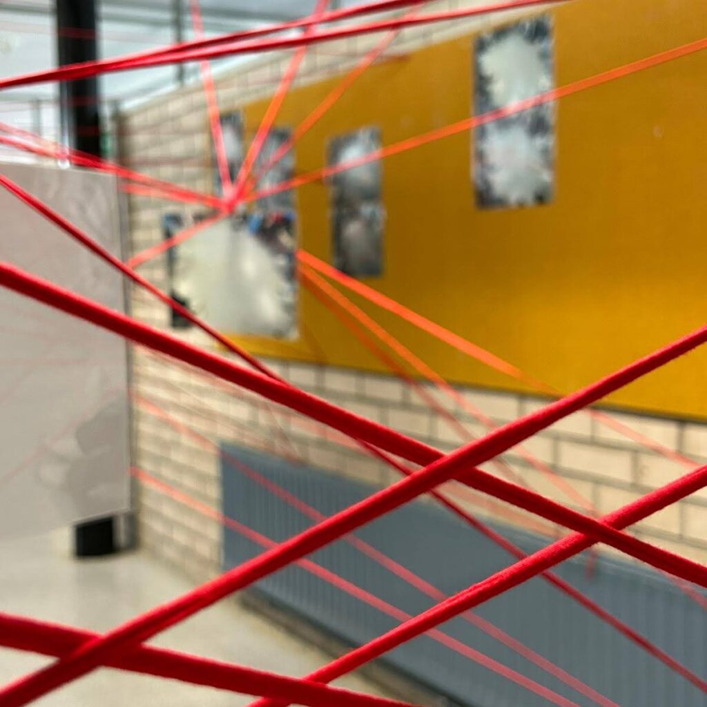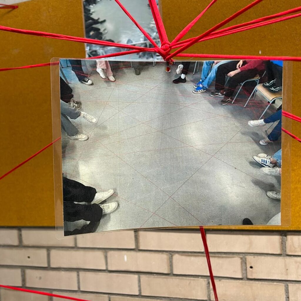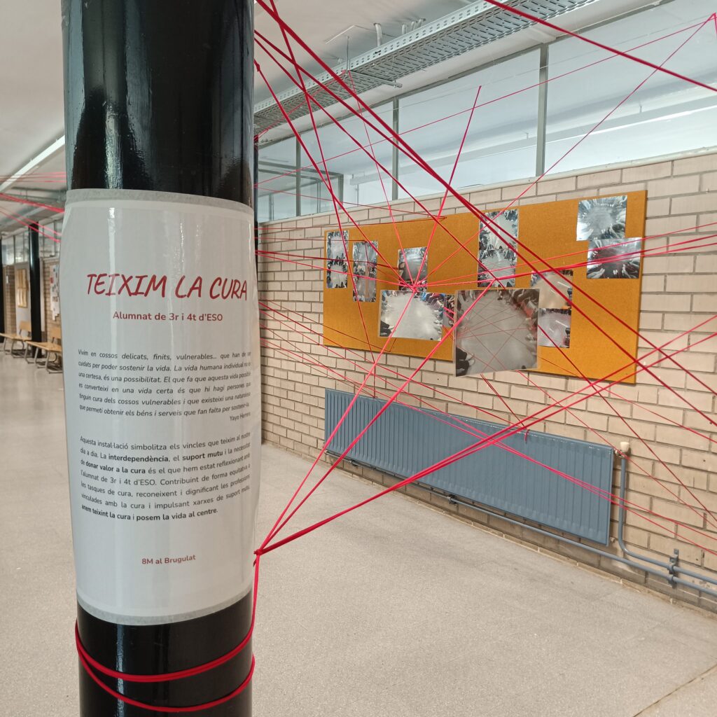 Aquest 8 de març hem estat treballant la interdependència, el suport mutu i la necessitat de donar valor a la cura amb l’alumnat de 3r i 4t d’ESO. La instal·lació obtinguda simbolitza aquestes relacions, vincles i xarxes que teixim al nostre dia a dia.