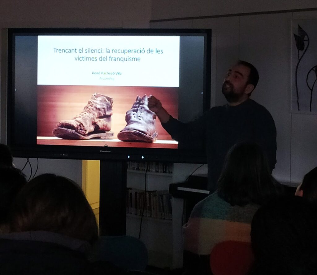 Ahir dilluns vam arrencar les Jornades de Memòria i Antifeixisme amb la xerrada “Trencant el silenci: les víctimes del franquisme”, a càrrec de l’arqueòleg forense René Pacheco, que va tenir lloc a la tarda a la Bruguteca, davant d’una assistència nombrosa de membres de la comunitat educativa: alumnat, professorat i famílies.