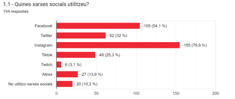 En quant a xarxes socials, majoritàriament utilitzen Whatsapp, Instagram i Facebook i molt pocs utilitzen o coneixen Twitch. Hi ha un 10% que no fa servir cap xarxea social. Altres xarxes socials també utilitzades són Linkedin i TikTok. Cal destacar que un 70% de les famílies no segueixen cap perfil de l’Institut.