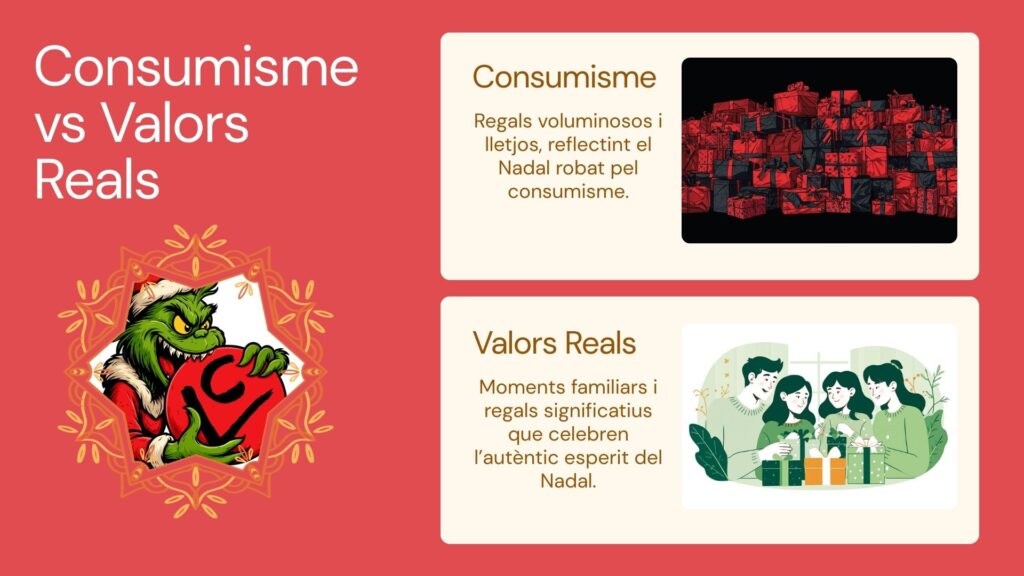 Aquesta setmana, l’alumnat de primer d’ACO i segon de GVEC ha treballat conjuntament per crear una decoració de Nadal al centre que vol transmetre un missatge profund i reflexiu. El fil conductor de la decoració és trencar amb el consumisme associat a les festes i recuperar l’essència real del Nadal: un temps de connexió, d’unió, de moments compartits amb amics i familiars, i de gaudir de les petites coses que realment importen.