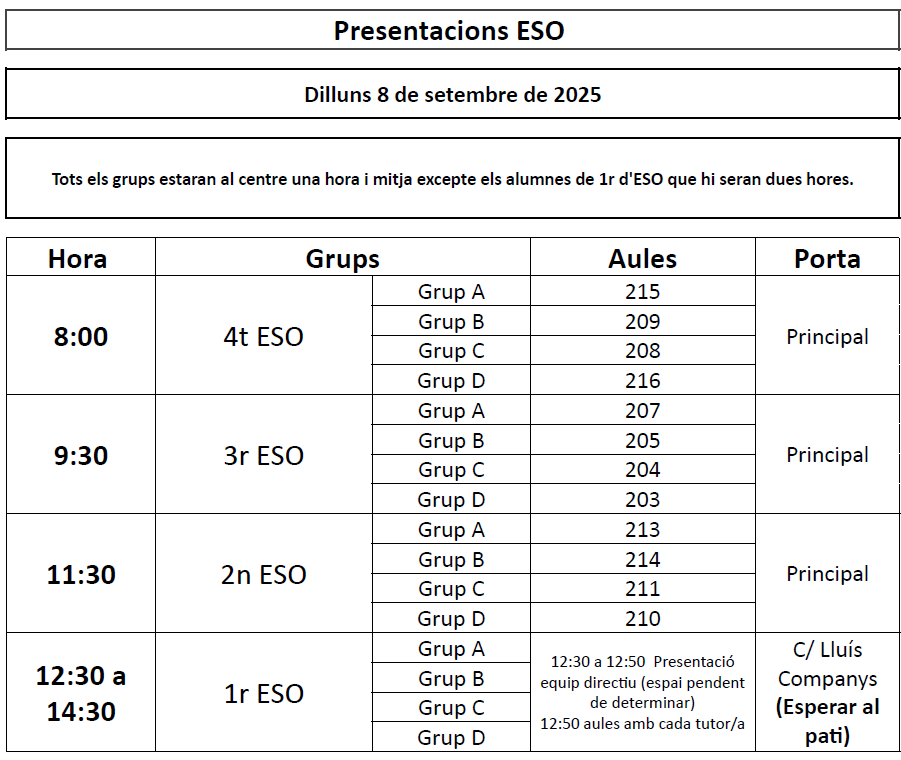 No cal que portin el portàtil ni els llibres. Només un bolígraf o llapis. Se’ls hi entregarà la carpeta i l’agenda amb l’horari de classe. L’alumnat de 1r d’ESO començarà a les 12:30 amb una breu presentació de la directora i l’equip de tutors/es i acabarà a les 14:30. La resta de cursos podran marxar després de les presentacions dels seus respectius tutors/es.