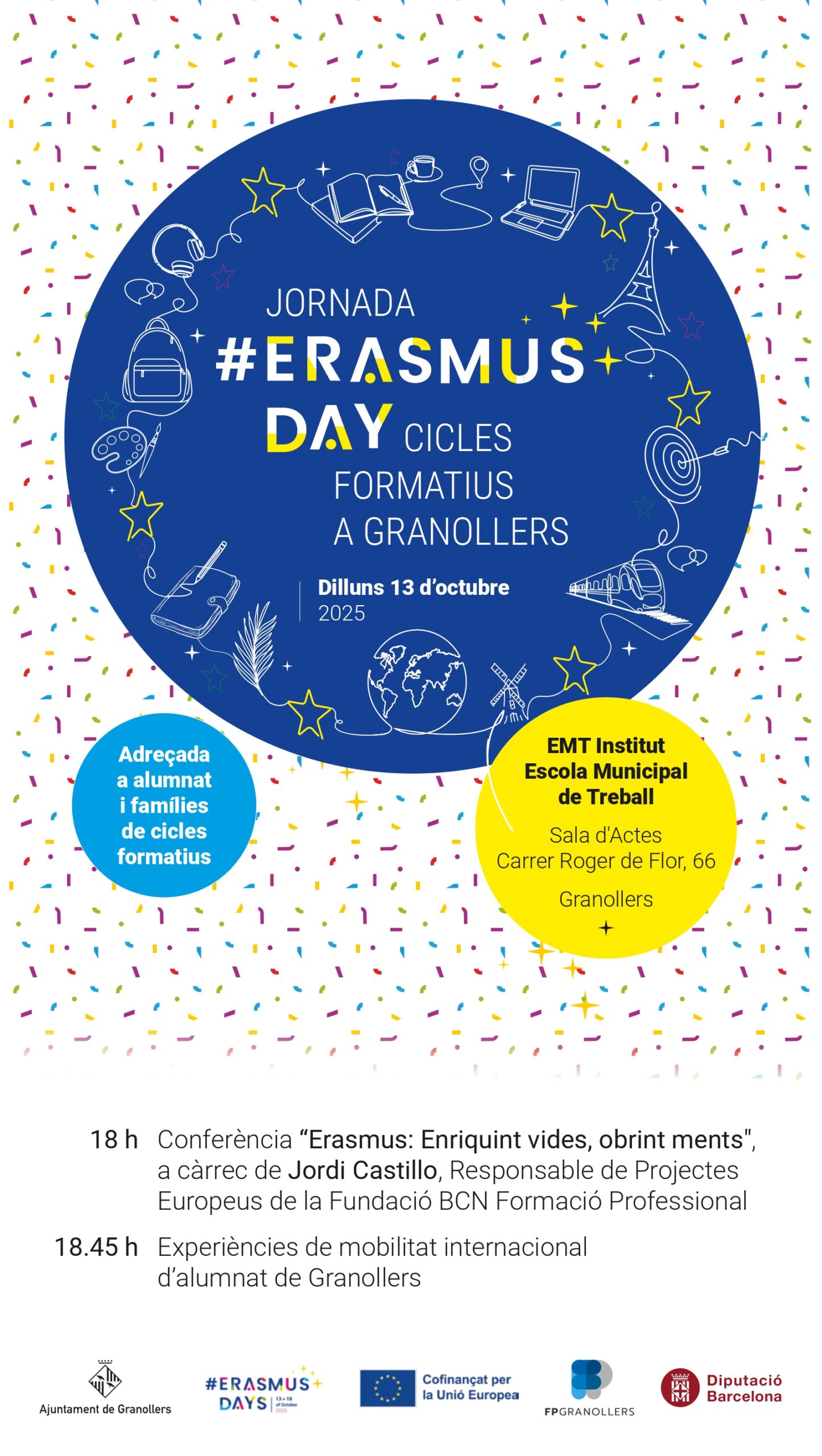 El passat dilluns es va celebrar a la sala d’actes de l’Institut Escola Municipal del Treball (EMT) una nova edició de l’Erasmus Day, la jornada conjunta dels centres d’FP de Granollers que organitzen mobilitats internacionals dins del programa Erasmus+.