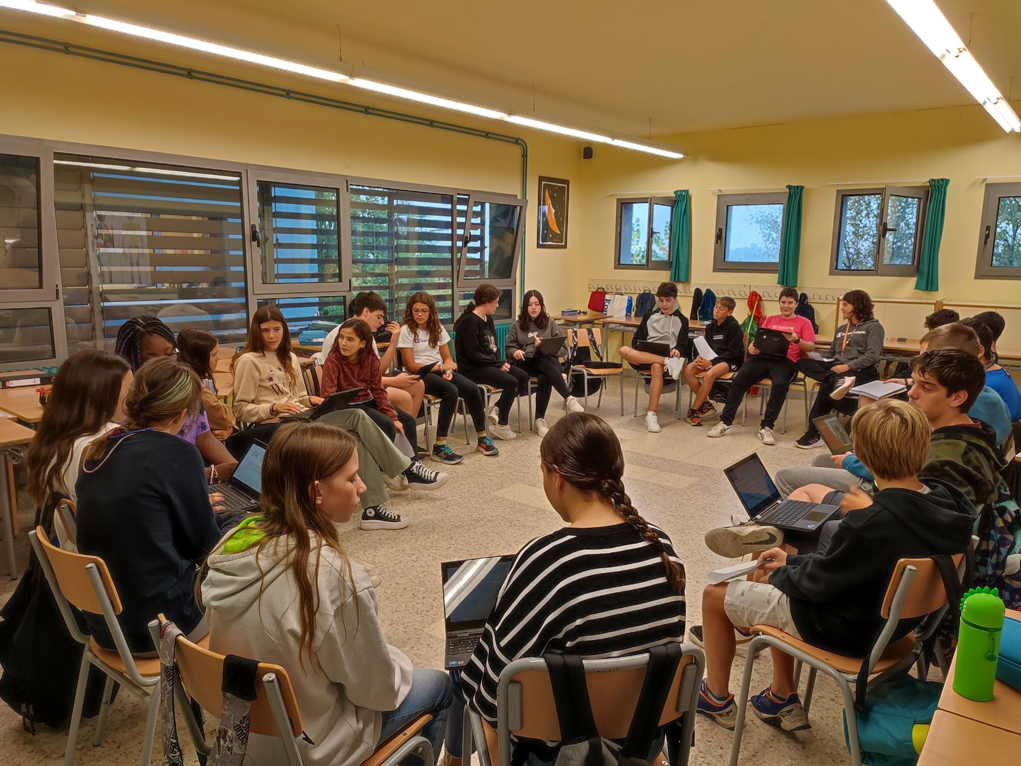 La primera activitat que s’ha dut a terme consisteix en el següent: els alumnes de 3r expliquen al nou alumnat diverses accions pròpies del centre (les celebracions, els viatges i altres activitats que s’organitzen a l’institut), amb l’ajuda de suports visuals com presentacions per fer l’explicació més amena.