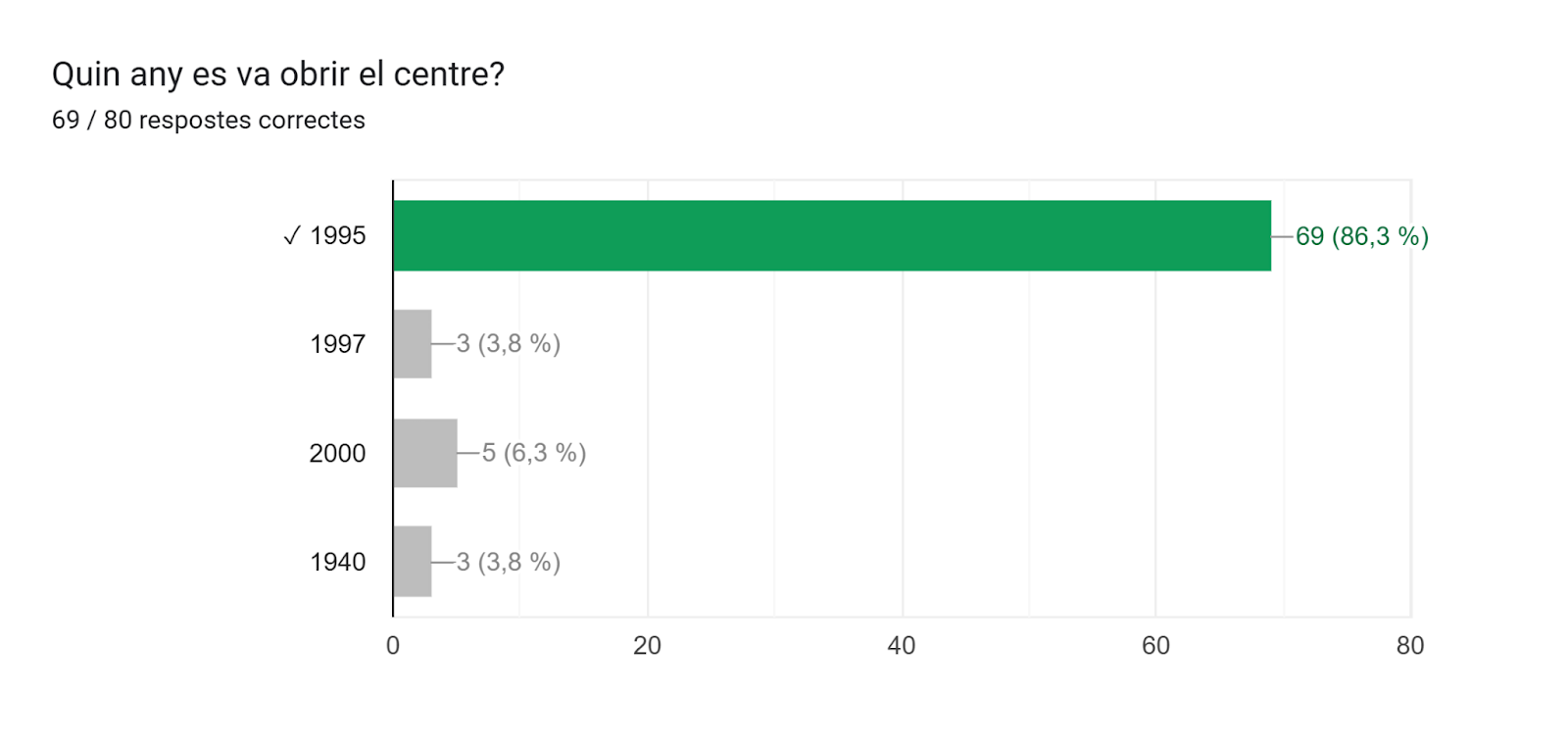 Pel que fa la primera pregunta, “quin any es va obrir el centre”, 69 de les 80 respostes obtingudes l’han encertat. Per tant un 86,3% de l’alumnat que l’ha contestat, saben quin any es va obrir.