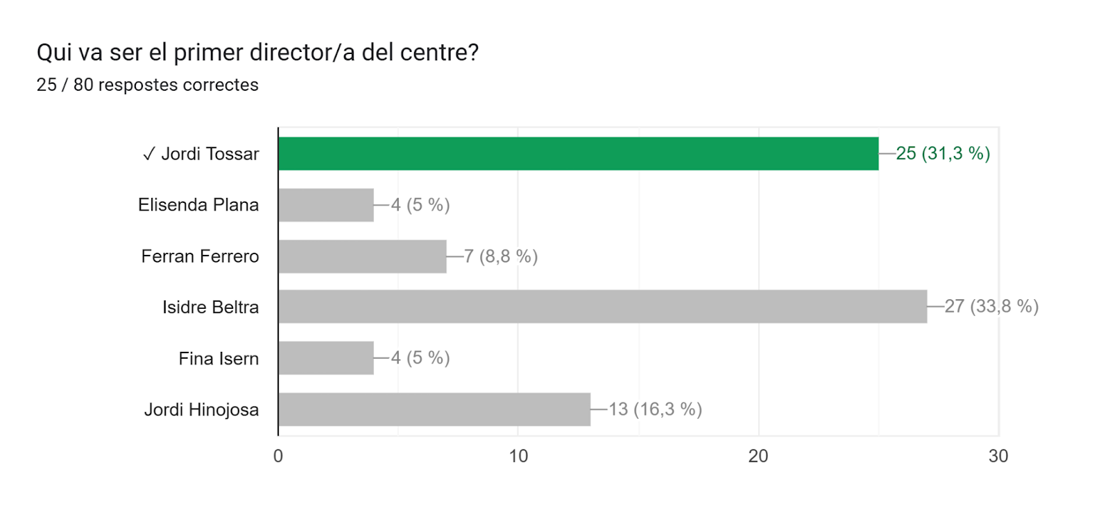 Pel que fa a la cinquena pregunta, “Qui va ser el primer director/a del centre?”, gairebé la majoria l’ha posat correcta (25 persones, un 31,3%), tot i que l’opció amb més respostes és incorrecta.