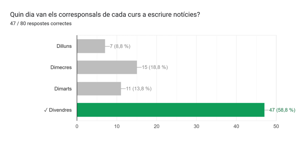 Pel que fa la pregunta “Quin dia van els corresponsals de cada curs a escriure notícies?, 47 persones, és a dir un 58,8% de les respostes han posat l’opció que és correcta.