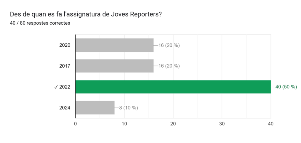A la pregunta “Des de quan es fa l’assignatura de Joves Reporters?”, un 50% de les respostes han estat correctes.