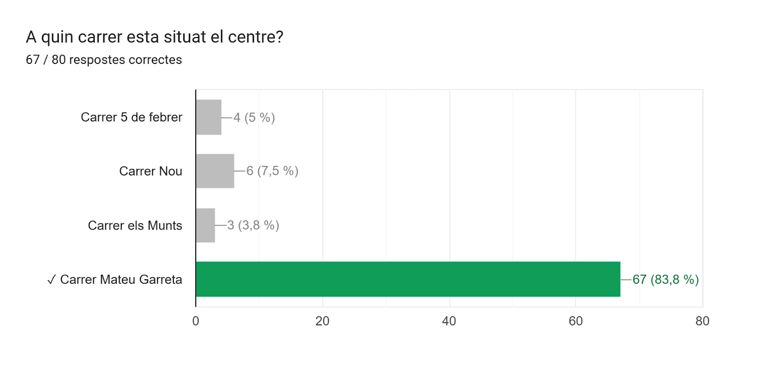 Pel que fa la pregunta “A quin carrer esta situat el centre?”, 67 persones, és a dir el 83,8% dels alumnes que han contestat, han triat l’opció correcta.