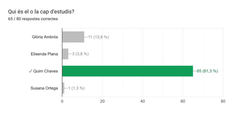 Per acabar, l’última pregunta, “Qui és el o la cap d’estudis?, un 81,3% de les respostes han triat la correcta “Quim Chaves”.