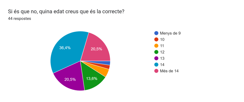 Respecte a la segona pregunta, un 36,4% creuen que una bona edat per tenir el mòbil és amb 14 anys, un 20,5% creuen que han de tenir mòbil amb 13 anys i un 20,5% creuen que l’haurien de tenir amb més de 14 anys.