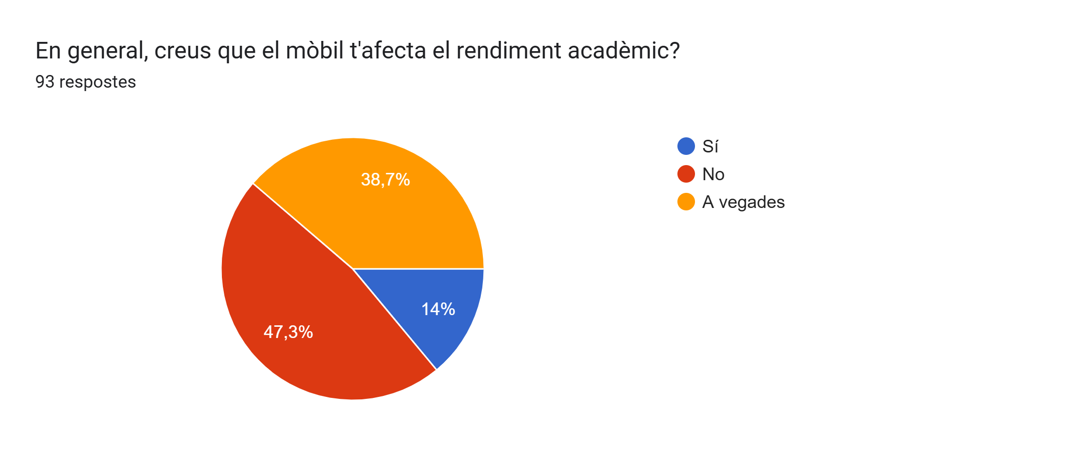 Finalment, a l’última pregunta van respondre que un 14% els mòbil els afecta al rendiment acadèmic, un 47,3% no i un 38,7% a vegades.
