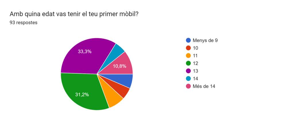 En la primera pregunta, hem esbrinat que un 6,5% dels alumnes van tenir el primer mòbil amb menys de 9 anys, un 5,4% amb 10 anys, un 7,5% amb 11 anys, un 31,2% amb 12 anys, un 33,3% amb 13 anys, un 5,4% amb 14 anys i un 10,8% mes de 14 anys. D’aquests, un 75,3% pensen que sí que és l’edat adequada, i el 24,7% restant pensen no.