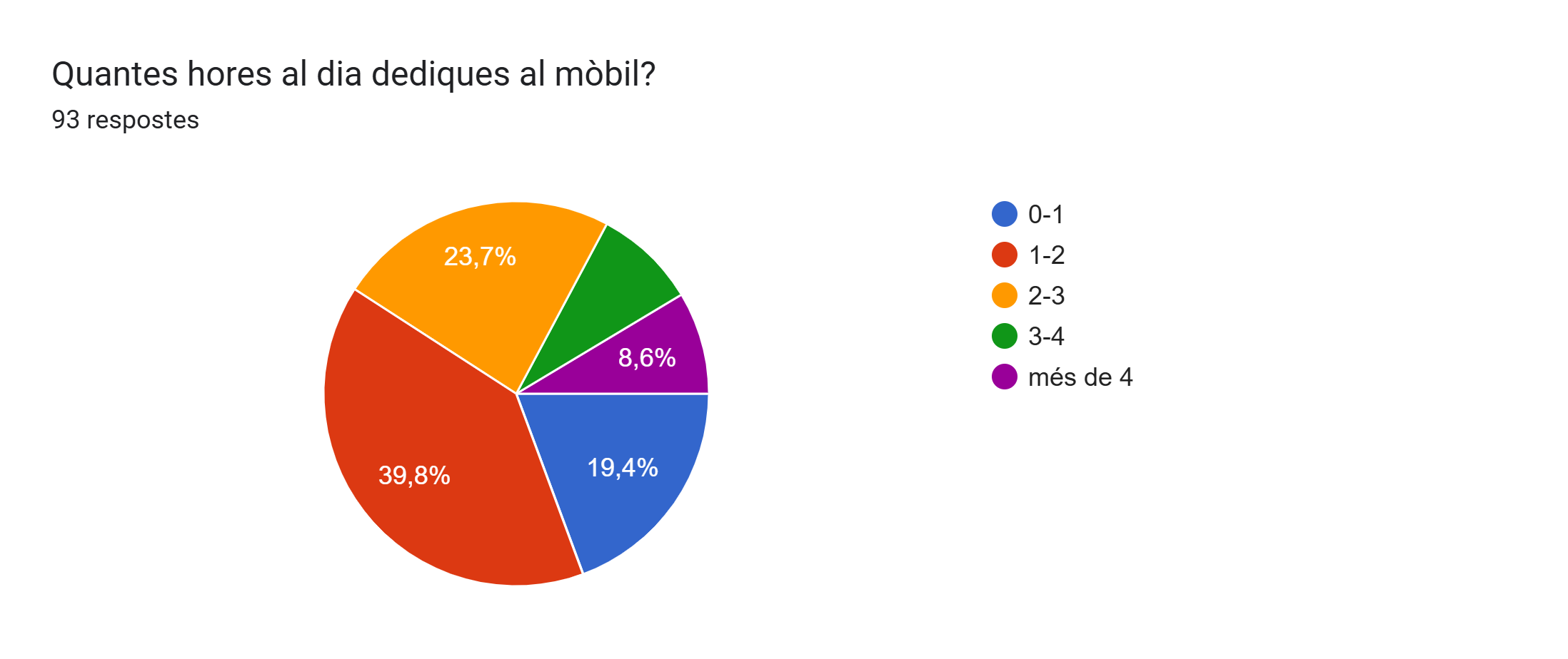 A continuació, la tercera pregunta es refereix sobre quantes hores al dia dediquen al mòbil: un 19,4% dediquen al mòbil de 0-1 hores al dia, un 39,8% dediquen al mòbil de 1-2 hores al dia, un 23,7% dediquen al mòbil de 2-3 hores al dia, un 8,6% dediquen al mòbil de 3-4 hores al dia i un 8,6% dediquen al mòbil de 4-3 hores al dia.