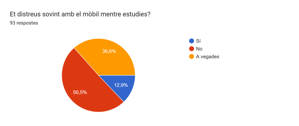 Pel que fa a la quarta pregunta, un 50,5% pensen que no es distruen amb el mòbil mentre estan estudiant, un 36,6% pensen que a vegades i un 12,9 pensen que sí que es distreuen.