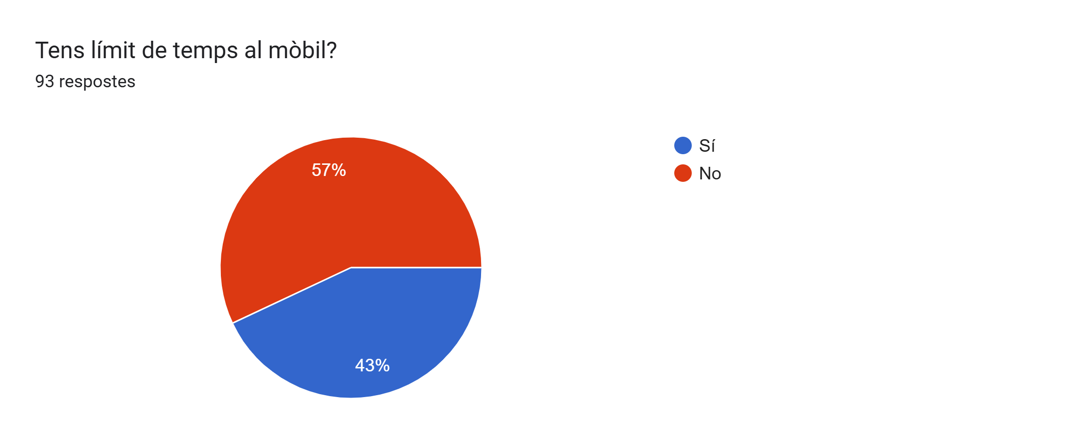 Respecte a la sisena pregunta, un 57% d’alumnes no tenen límit de temps al mòbil i un 43% han posat que sí que en tenen.