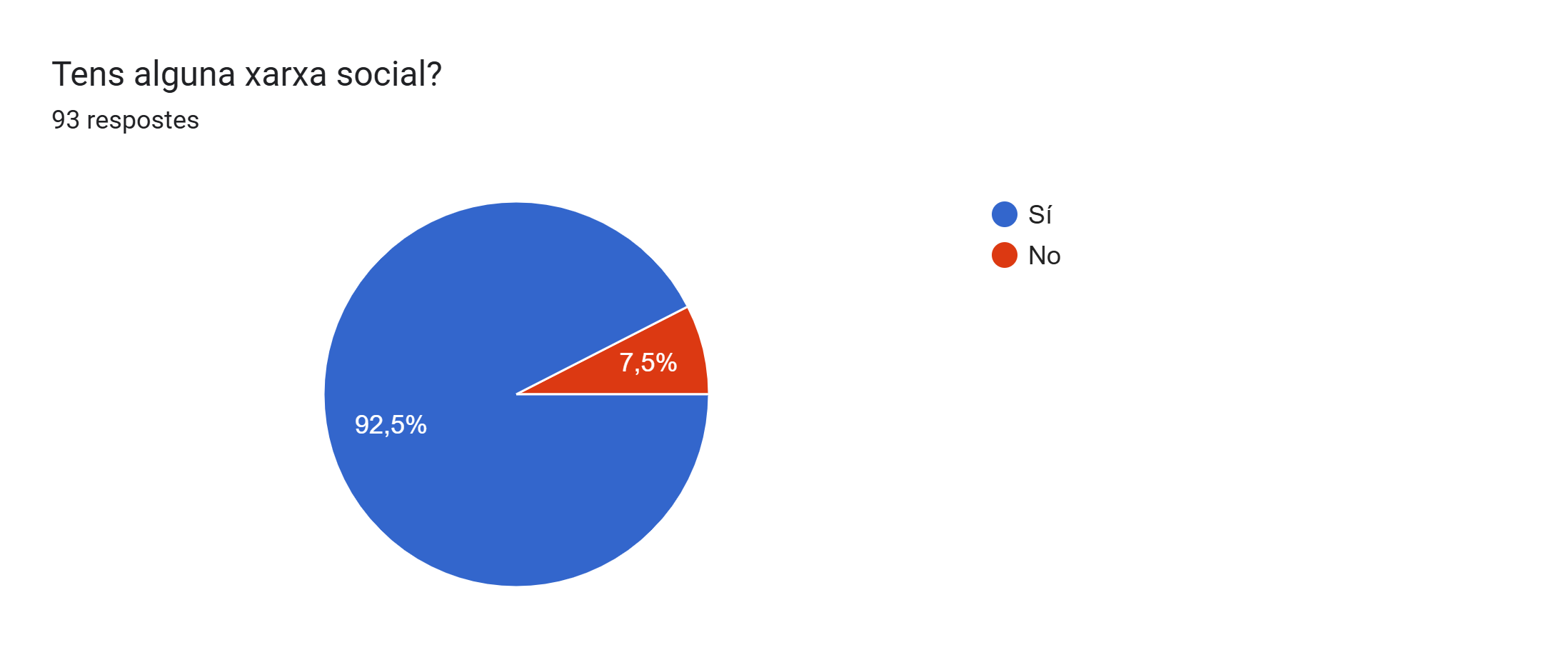 A continuació, vam fer la pregunta de si tenen xarxes socials. Un 92,5 sí que en tenen, i la resta, un 7,5% no en tenen.