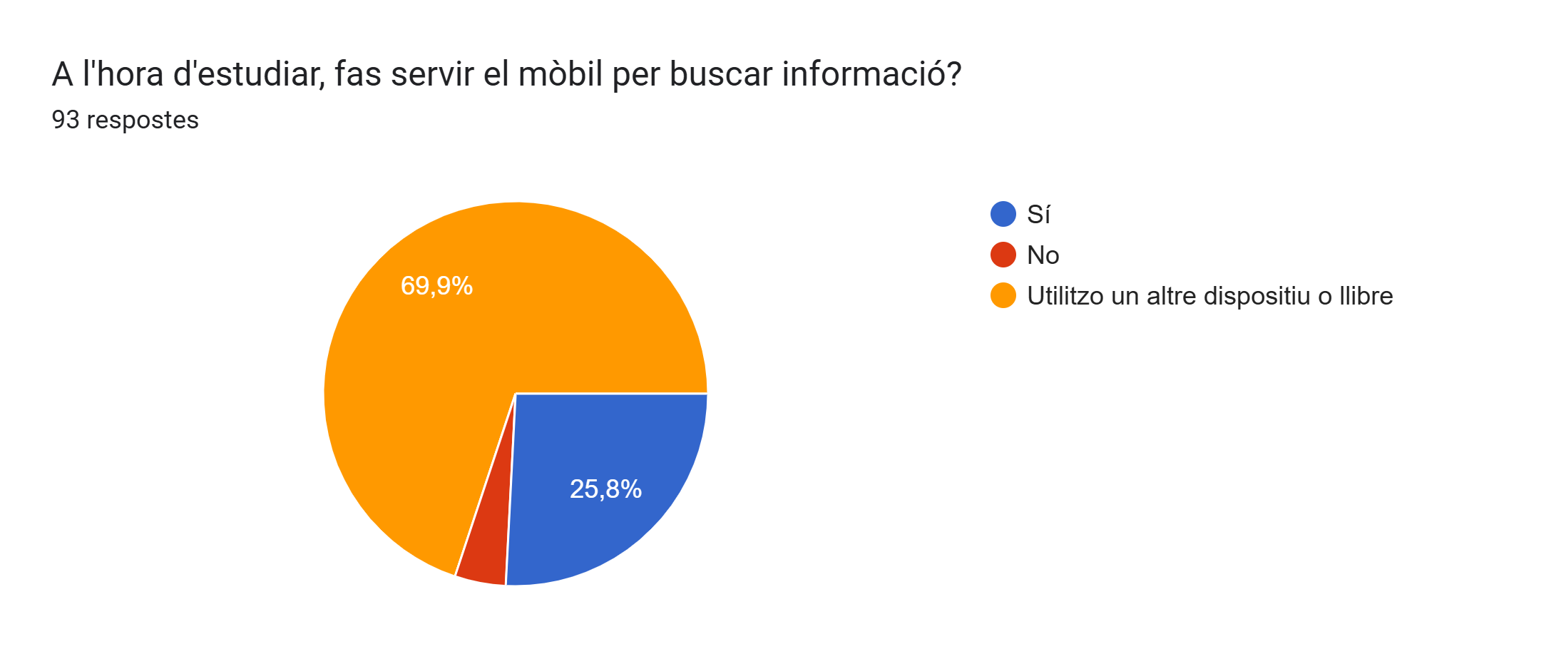 Després, la següent pregunta que es refereix sobre si fan servir el mòbil per buscar informació, un 69,9% utilitza un altre dispositiu o llibre; el 25,8 fan servir el mòbil mentre estudien.