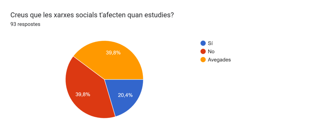 A la pregunta “Creus que les xarxes socials t’afecten quan estudies?”, el resultat és el següent: un 20,4% creu que sí; un 39,8% no els afecta, i un altre 39,8% els afecten a vegades.