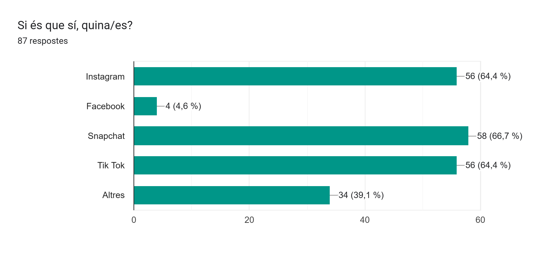 Seguidament, vam preguntar quina xarxa/es socials tenen. Va sortir com a resultat que un 64,4% tenen Instagram, un 4,6 tenen Facebook, un 66,7% tenen Snapchat, un 64,4% tenen Tik Tok i un 39,1% tenen alguna altra xarxa social.