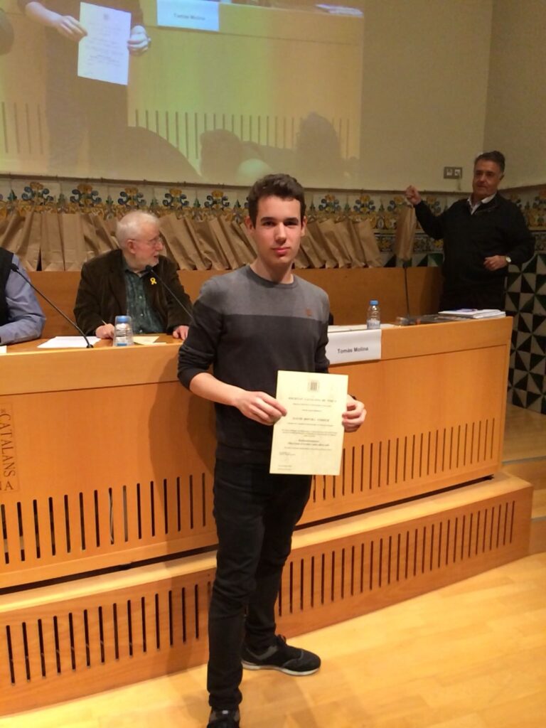 El passat divendres 9 de març es va fer el lliurament oficial dels premis de la Societat Catalana de Física pels treballs de recerca de batxillerat del curs 2016-17. La cerimònia va tenir lloc a Barcelona, a l’Institut d’Estudis Catalans. El primer premi el va recollir l’alumne del nostre centre, David Rovira, pel seu treball “Radioastronomia: observant el Cosmos amb altres ulls”. Per la realització del treball va comptar amb l’ajuda inestimable dels investigadors del projecte PARTNeR. El David va poder realitzar observacions reals de 2 objectes astronòmics amb un radiotelescopi de 34 m de diàmetre. La informació recopilada en aquestes observacions va servir per fer un senzill estudi sobre l’origen de la radiació emesa per cadascuna d’aquests fonts. Esperem i desitgem que exemples com aquest i d’altres serveixin per encoratjar els alumnes de batxillerat en la confecció dels seus futurs treballs de recerca.
