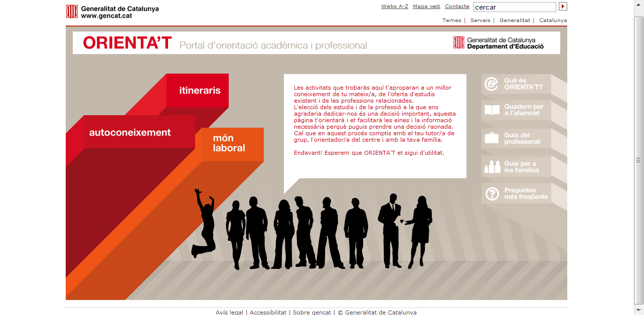 El Departament d’Educació posa a l’abast de professorat i alumnes una web destinada a la tutoria i a l’orientació: Orienta’t. Si bé l’any passat ja estava en marxa, algunes funcions no estaven operatives.