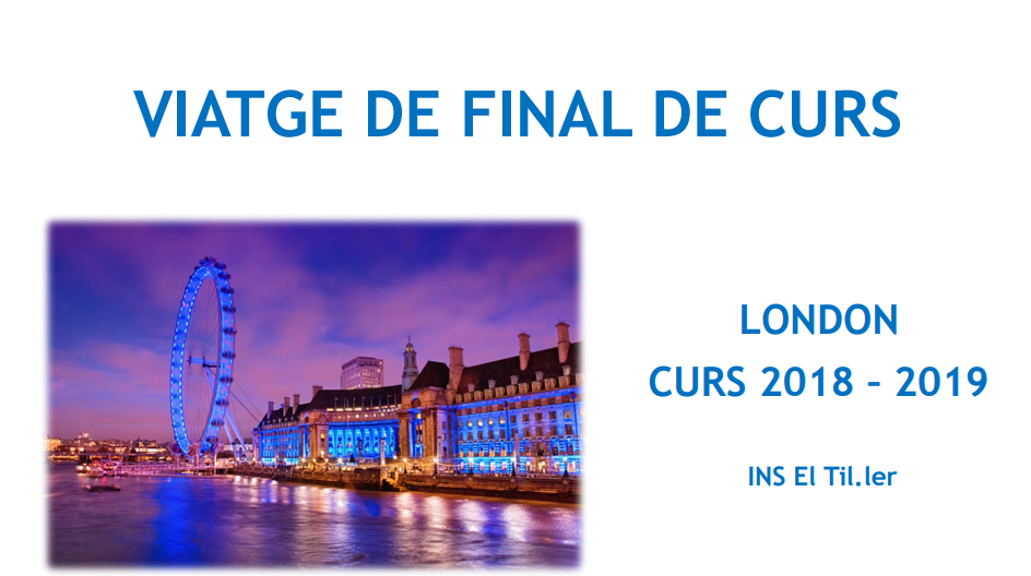 Presentació per les famílies dels alumnes de 4t que van a Londres admin14/03/19 Estimades famílies, Us fem arribar la presentació del viatge de 4t a Londres que ens ha proporcionat l’empresa organitzadora. Esperem que us sigui útil. Premeu sobre la imatge per descarregar l’arxiu.