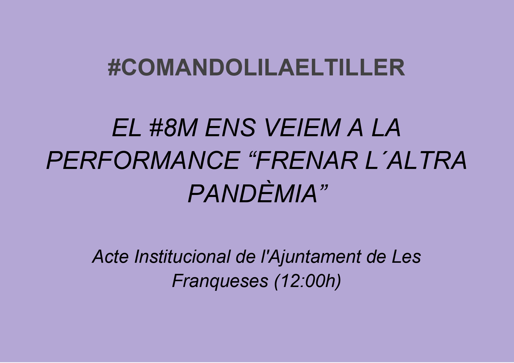 #comandolilatiller: Frenar l’altra pandèmia admin05/03/21 Estimades famílies, Amb motiu del 8M, les nostres alumnes de #comandolilatiller us ofereixen una petita performance a les 12:00h a la Plaça de l´Ajuntament de Les Franqueses. Gaudiu-ne de la distopia “Frenar l´altra pandèmia”. Us hi esperem.