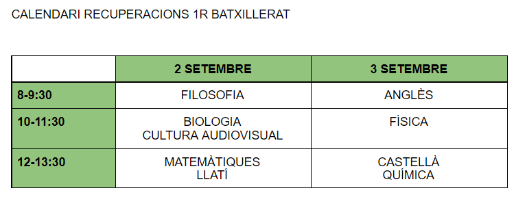 Calendari de recuperacions de setembre per 1r batxillerat admin22/06/21 Estimades famílies, Us informem del calendari de recuperacions de setembre de primer de batxillerat. LES RECUPERACIONS ES REALITZARAN A L’AULA 5 (PRIMERA PLANTA).