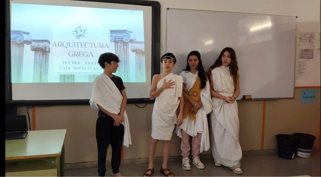 Fa uns dies l’alumnat de primer d’ESO va realitzar una sèrie d’exposicions orals sobre l’art de l’antiguitat de Grècia i Roma amb les vestimentes tradicionals de l’època treballada. Aquesta activitat va permetre a l’alumnat apropar-se d’una manera vivencial als continguts estudiats, tot combinant la recerca, l’expressió oral i la creativitat. Durant les presentacions, els i