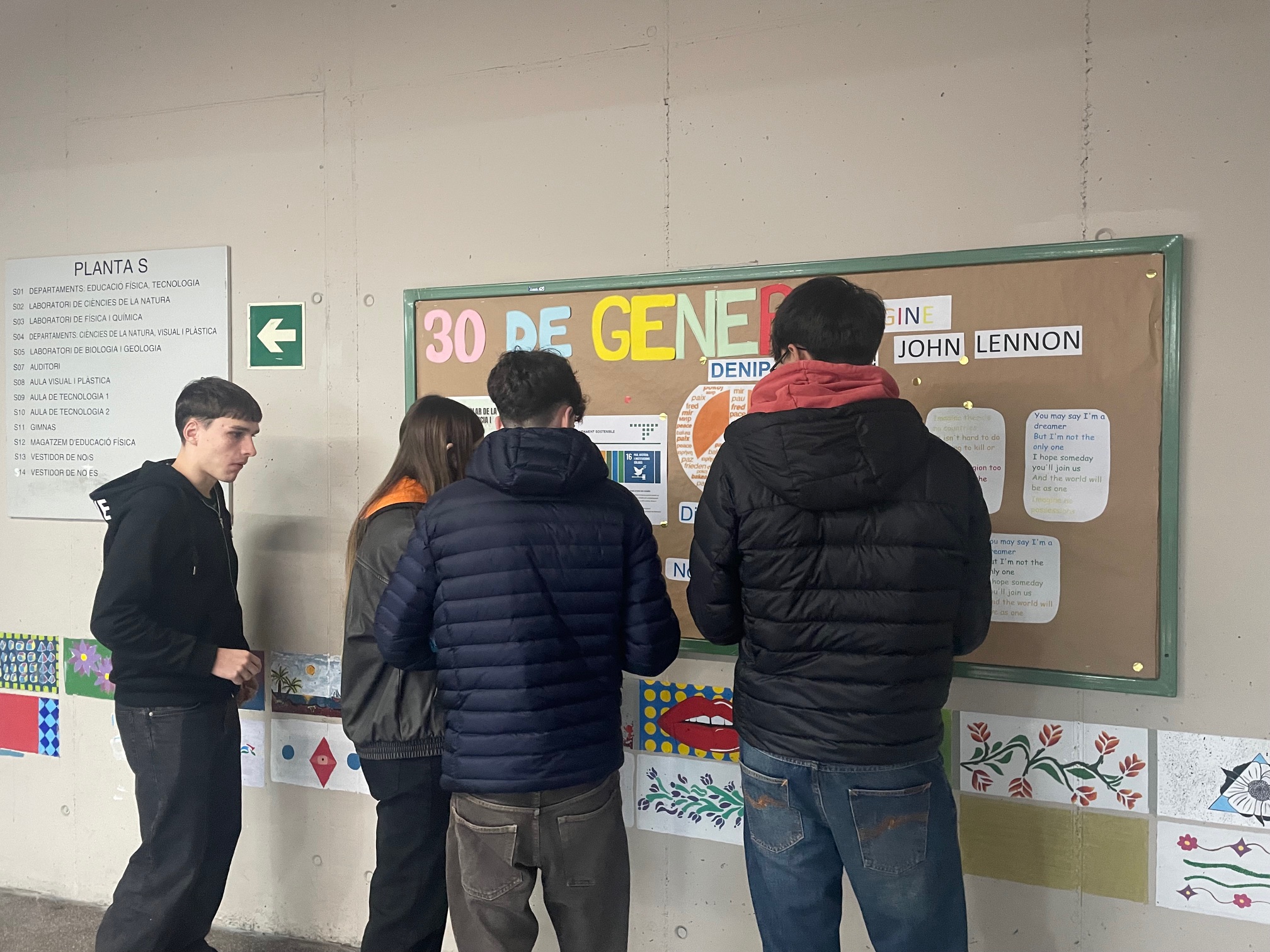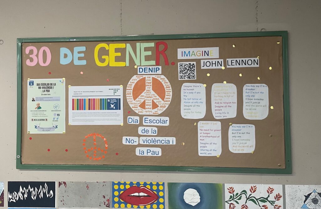 El 30 de gener commemorem el Dia Escolar de la No-violència i la PAU. Essent l’ODS 16 Promoure societats pacífiques i inclusives per tal d’aconseguir un desenvolupament sostenible, proporcionar accés a la justícia per a totes les persones i desenvolupar institucions eficaces, responsables i inclusives a tots els nivells, l’alumnat de 2n de batxillerat de la matèria d’ODS 17+1 ha preparat diverses actuacions per l’efemèride. Entre d’altres, disseny d’un cartell divulgatiu, activitats per a les tuotories i un mural per la PAU.