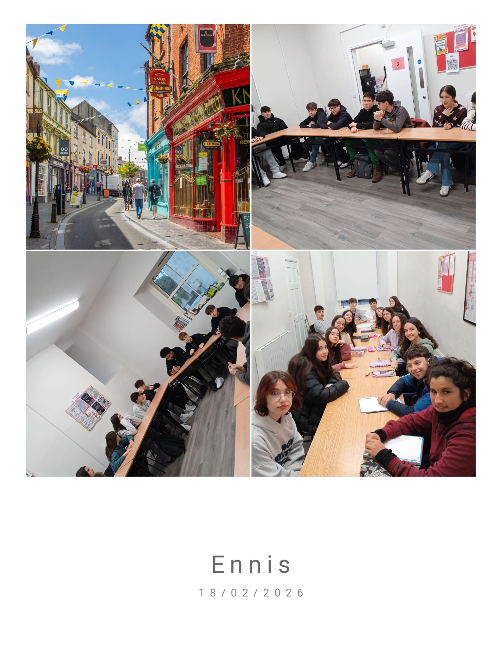 Avui ha estat un dia ben intens. De bon matí hem començat amb les classes, posant a prova el nostre anglès i les nostres ganes d’aprendre. Després d’una pausa per dinar i carregar energies, a la tarda hem fet un mini tour per la ciutat d’Ennis, descobrint els seus carrers amb encant i el seu ambient acollidor.