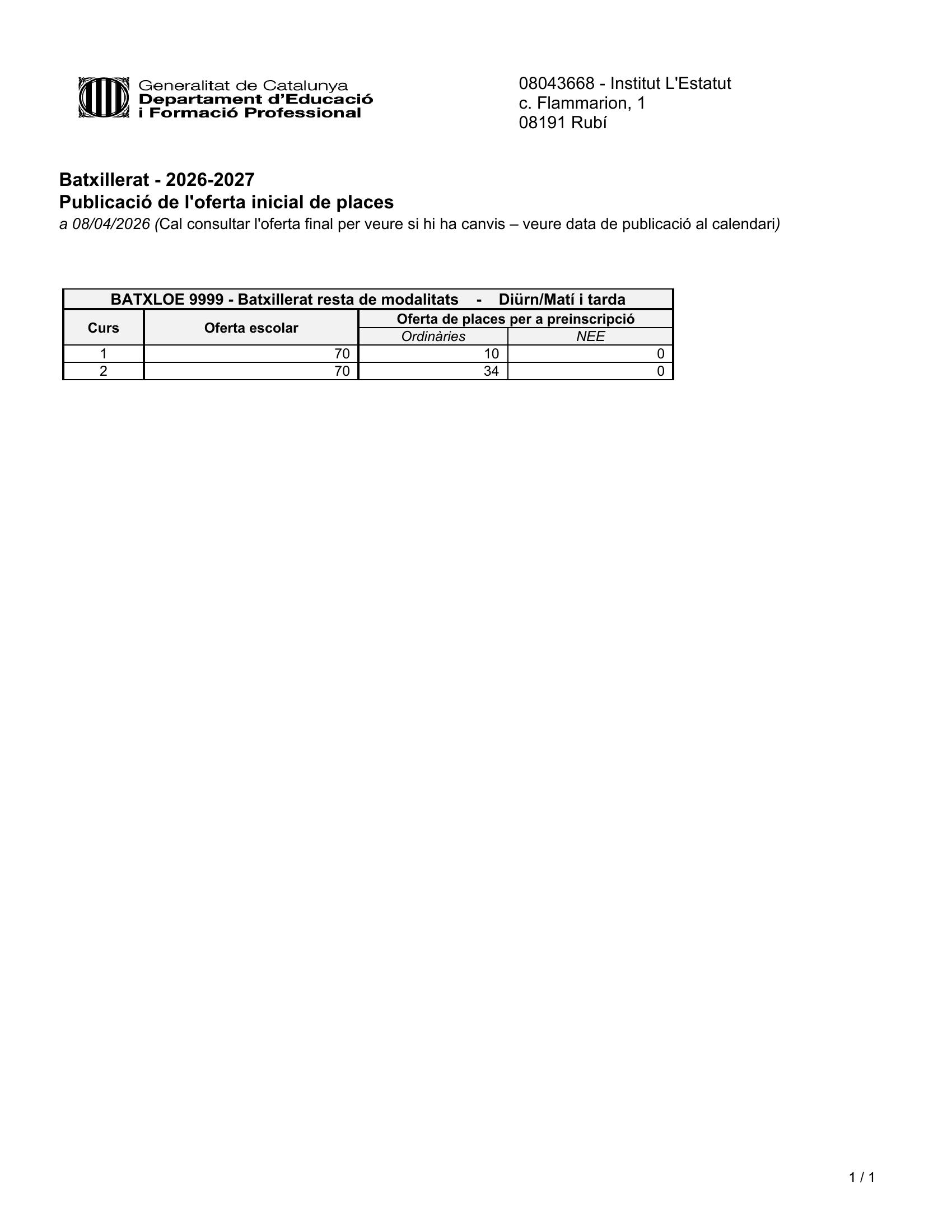 Oferta inicial de places de batxillerat Diego Muñoz08/04/26 Avui dimecres 8 d’abril s’ha publicat l’oferta inicial de places de batxillerat. A continuació podeu consultar-la: