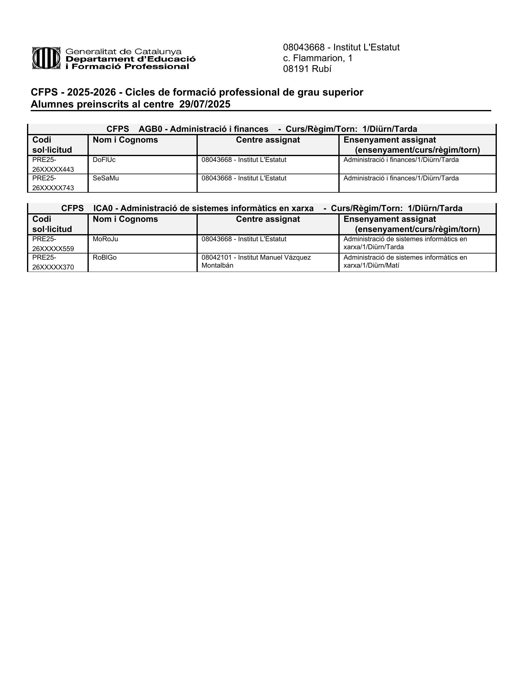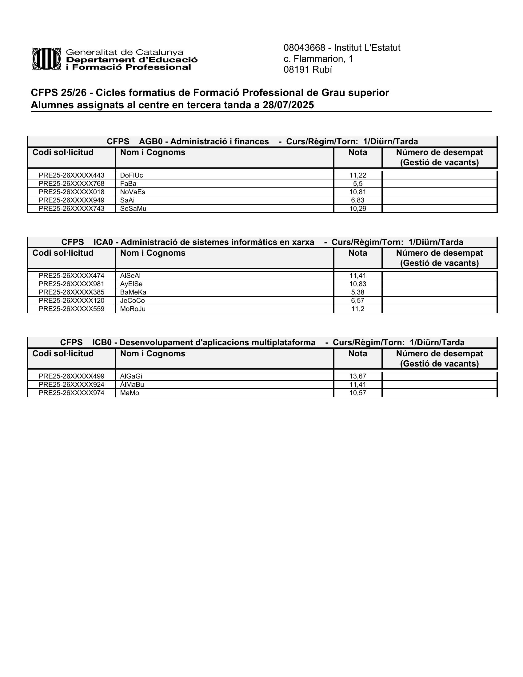 Llistat d’alumnes assignats i preinscrits en tercera tanda a Grau Superior Diego Muñoz29/07/25 Avui 29 de juliol s’ha publicat els llistats d’alumnes assignats i preinscrits al centre en tercera tanda de Grau Superior. A continuació podeu consultar-los: Assignats Preinscrits