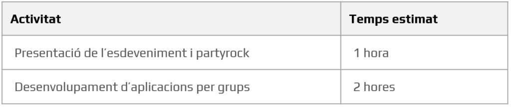 En cas que vulgueu conèixer millor l’eina abans del dia de la Hackathon, o si teniu curiositat i no podeu esperar fins al dia de la Hackathon, podeu consultar el tutorial de PartyRock on s’explica l’ús de l’eina i començar a fer les vostres proves!