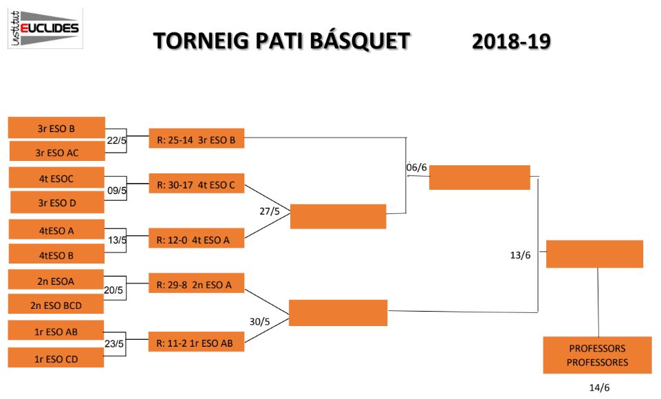 Felicitar a tots els equips que han fet possible que el torneig de bàsquet sigui una realitat. Després de jugar cinc partits, aquí teniu els resultats; Passen a la següent ronda 4t C- 4t A i 2n A – 1r AB. Els veurem a pista el proper 27 i 30 de maig’19.