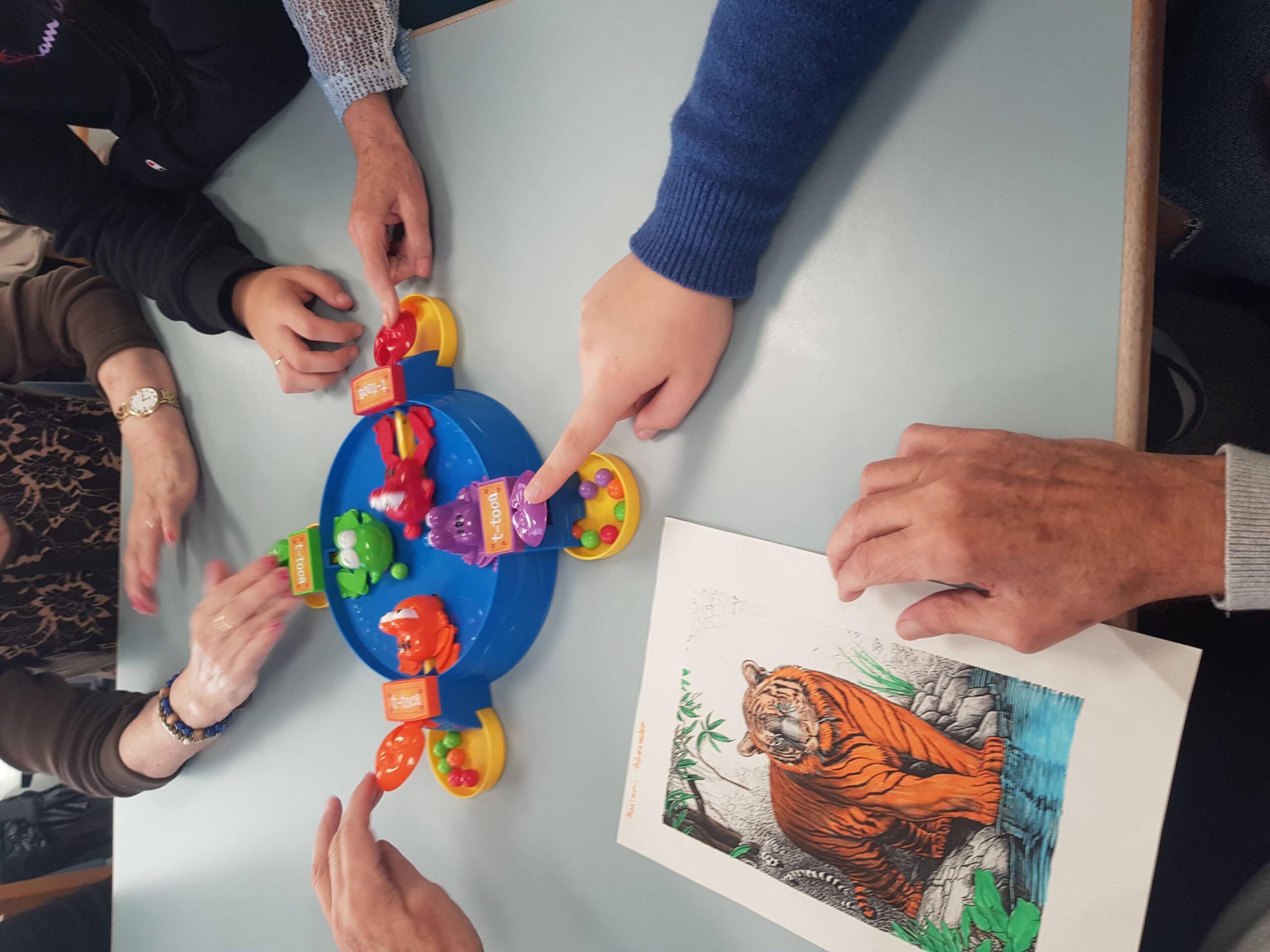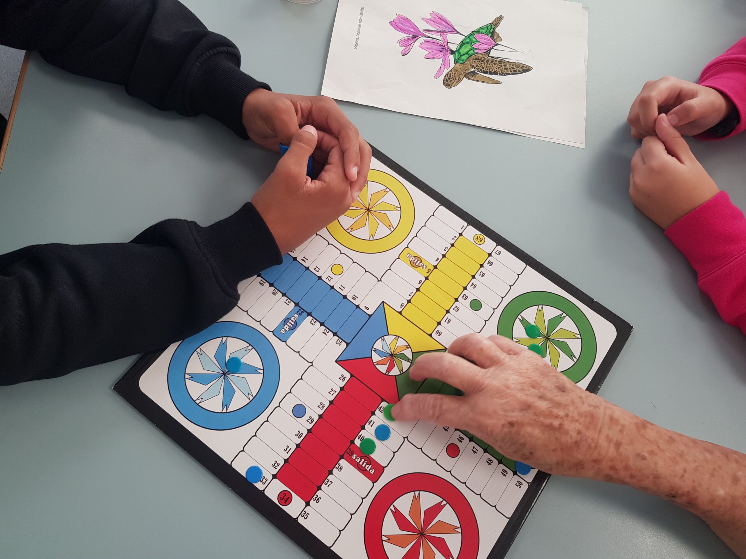 con la gente mayor y jugando al parchís