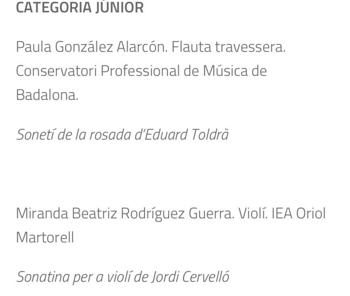 Ha quedat primera en la categoria Junior. Amb la millor interpretació d’una peça de música catalana “Sonetí de la Rosada” d’Eduard Toldrà.