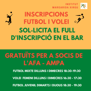 Ja pots inscriure’t als equips de futbol i volei. Les inscripcions es fan a la cafeteria, on pots rebre més informació. És gratuït per a socis de l’AMPA.
