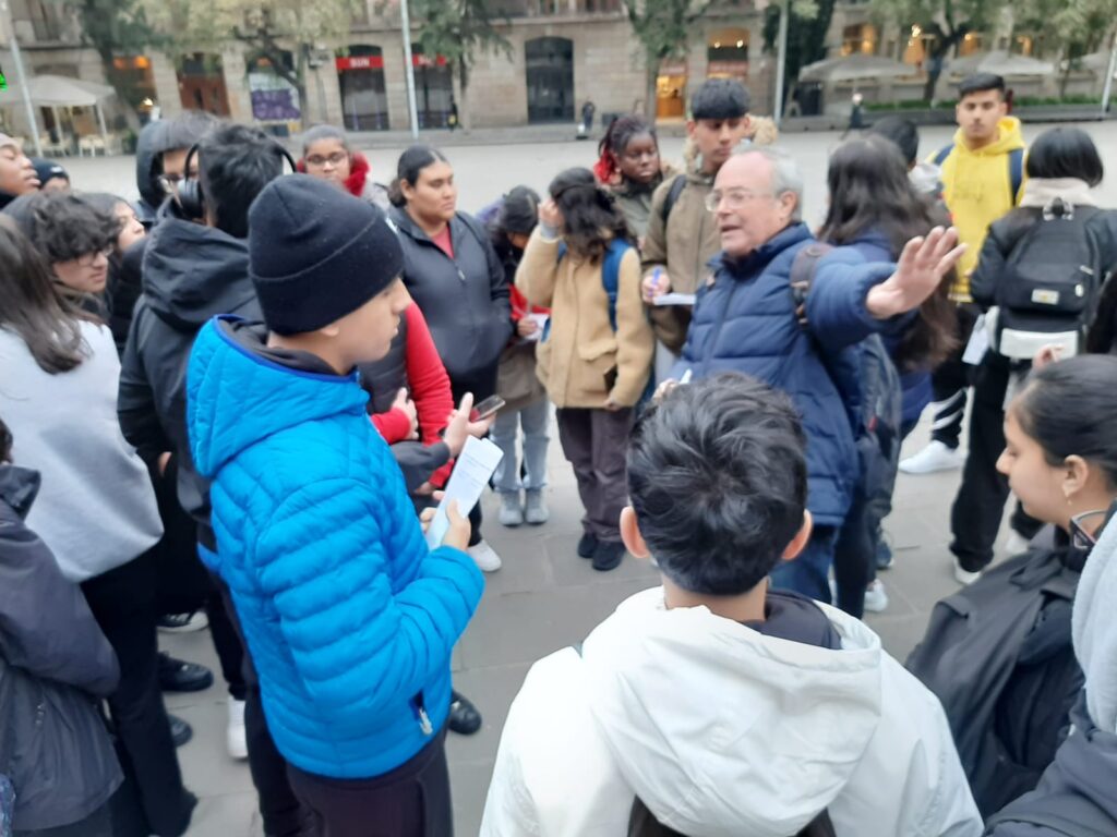 Els dos grups de 1r de Batxillerat volien conèixer de primera mà alguns dels llocs emblemàtics de Barcelona relacionats amb els escriptors baixmedievals Bernat Metge, Ausiàs March i Joan Roís de Corella, i els escriptors renaixentistes Joan Ferrandis d’Herèdia i Pere Serafí. El dia ha estat rúfol i núvol, però els llocs visitats han donat