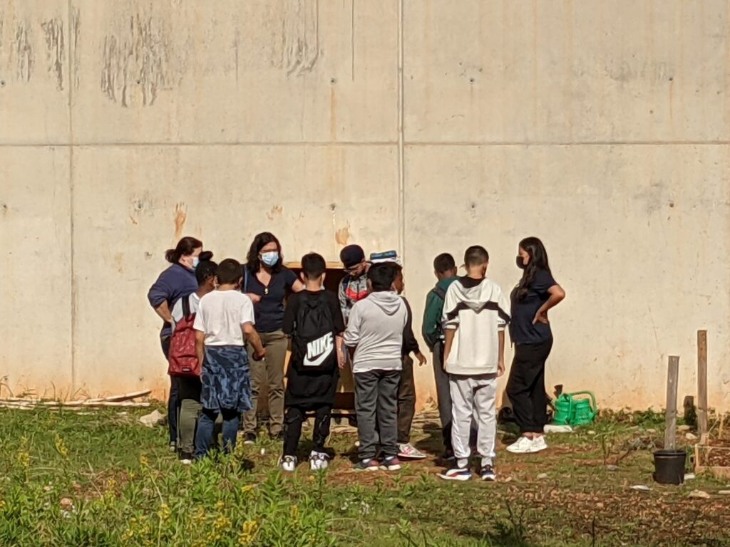 Els alumnes de 1r d’ESO que fem l’optativa d’hort, vam anar el 5 d’octubre a delimitar un dels bancals on plantarem vegetals, flors, etc. El terreny està darrera l’institut. Ens va ajudar l’Ivan, conserge de l’institut, i vam utilitzar unes estaques, un martell, una cinta de medir i un cordill. El bancal té 150 centímetres
