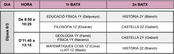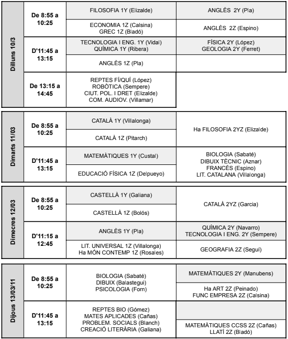 Exàmens de batxilleratPer Admin / 28/02/2025 / Batxillerat Curs 2425 / Exàmens Aquests són els horaris dels exàmens de Batxillerat per a la segona avaluació del curs 2024-2025.