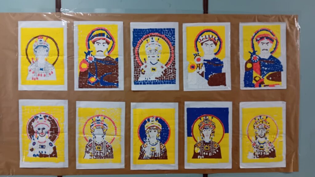 A Socials, els alumnes de 2n d’ESO han treballat l’art bizantí recreant un mosaic de l’emperador Justinià i l’emperatriu Teodora.