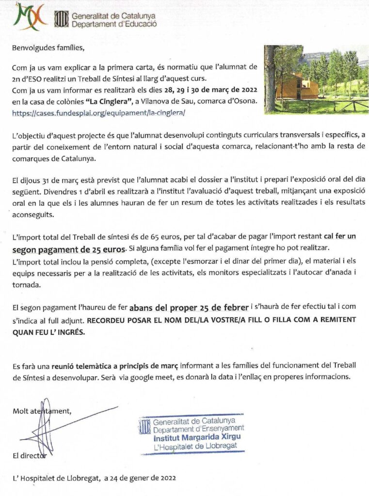 Us deixem la carta per a realitzar el segon pagament del treball de síntesi. Teniu temps per fer-ho fins el 28 de febrer. Aquesta carta s’ha repartit als vostres fills aquesta setmana. 22 – 23 -1r ESO 2a Carta famílies Treball de Síntesi 22 – 23 – 2n ESO 2a Carta famílies Treball de Síntesi