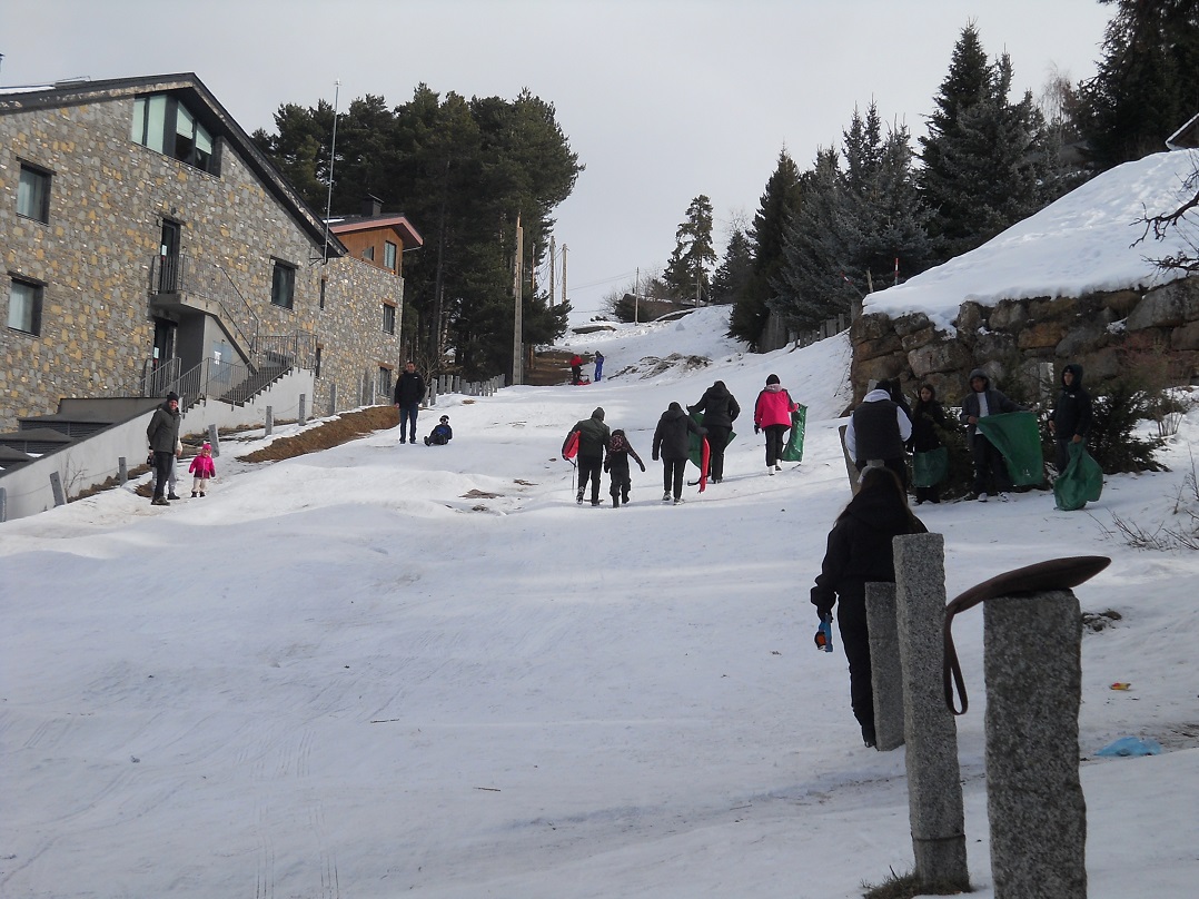 L’últim dia vam deixar les maletes enllestides ben d’hora. A les pistes ens va rebre una sorpresa: va començar a nevar i feia més fred, però l’ambient era genial. Els més valents vam fer baixades de velocitat des de dalt de tot, mentre que d’altres, més cansats, van fer una excursió per la neu o van improvisar trineus amb bosses de brossa per baixar per un turó.