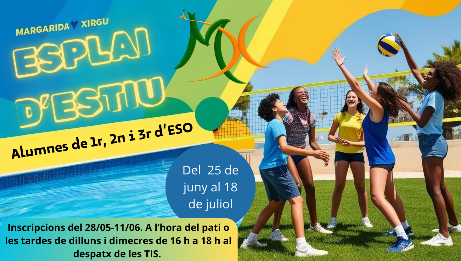 Si estàs a 1r, 2n o 3r d’ESO i vols gaudir d’activitats a l’aire lliure, vine al casal d’estiu al Xirgu! Del 25 de juny al 18 de juliol, de 9:30h. a 13h. Pots fer la teva inscripció a l’hora del pati al despatx de les TIS a partir del 28 de maig.